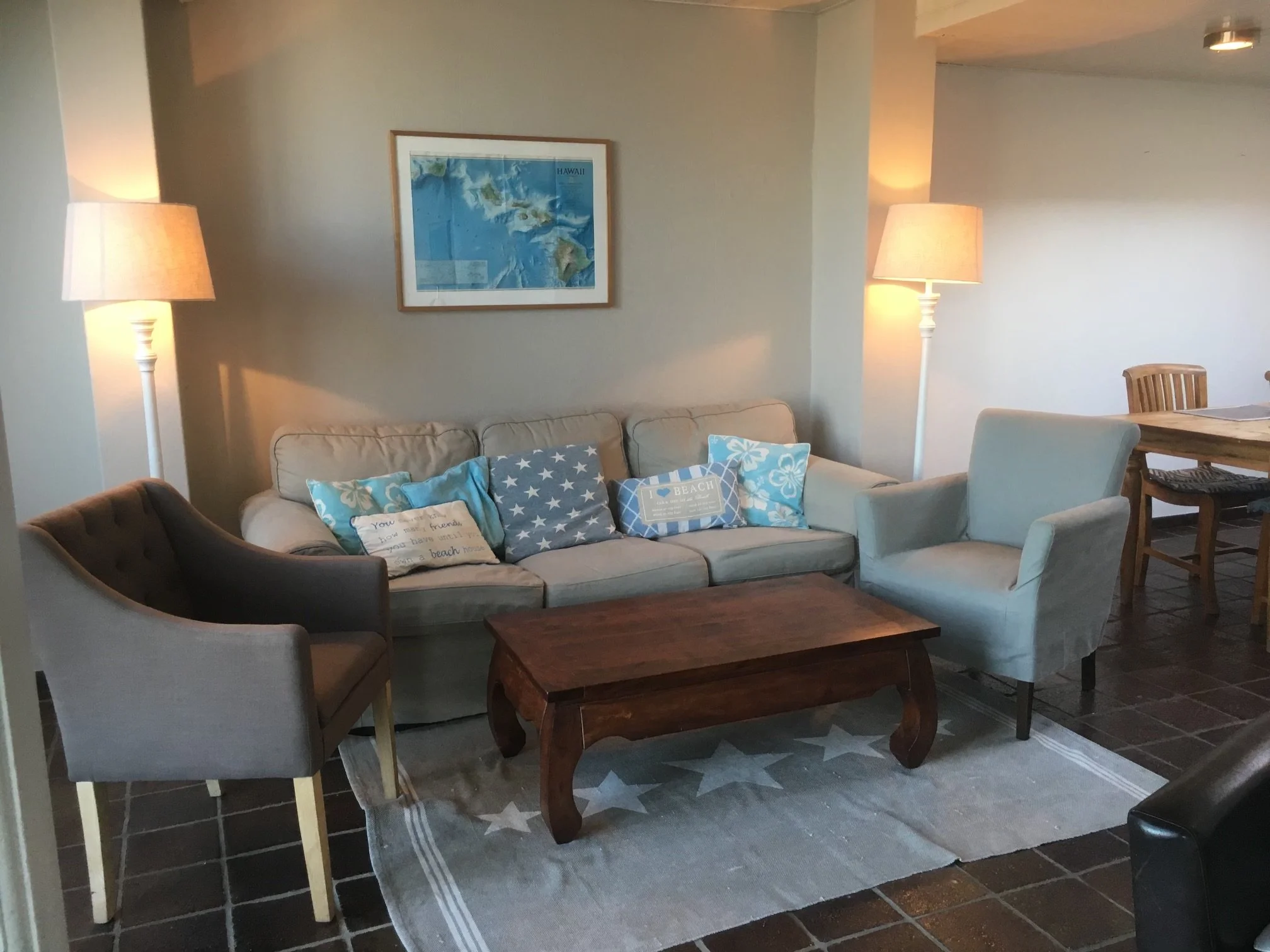 Das Pacific mit 120 m² Wohnfläche liegt in der vorderen, rechten Haushälfte und bietet auf dem Balkon einen atemberaubenden Blick auf die Nordsee. Unten gibt es neben dem Eingangsbereich mit Gäste-WC ein großes Wohnzimmer mit offenem Kamin, an den sich eine offene Küche und der Essplatz anschließen. In der oberen Etage liegen zwei Schlafzimmer, von denen eines Meerblick bietet. Direkt an diesem Schlafzimmer befindet sich ein wunderschöner Balkon, der einen weiten Blick über das Dorf und den Strand ermöglicht. Das zweite Schlafzimmer mit zwei Einzelbetten ist zur Landseite orientiert und verfügt über einen eigenen Waschplatz. Außerdem gibt es auf der oberen Etage das Badezimmer mit Dusche und Toilette. Die Ausstattung mit TV, Wi-Fi sowie einer gut eingerichteten Küche mit Spühlmaschine, Kinderbettchen und Hochstuhl lässt keine Wünsche offen. Ein PKW-Stellplatz gehört auch zum Pacific.